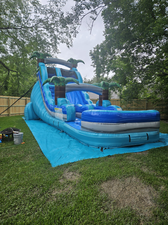 Dive into a splash of excitement with the 18ft Bahama Blast Single Lane Waterslide! This rental transforms any event into an action-packed playground, featuring a long, sliding lane where water adds a refreshing twist. Perfect for birthday bashes, school events, or any party in need of a cooling thrill, it's built to deliver fun and memorable moments for everyone involved.